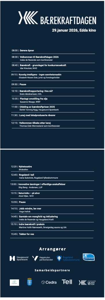 Derfor gleder vi oss over å kunne arrangere bærekraftdagen nok en gang, og med et like faglig sterkt program som i fjor. Denne gangen arrangeres bærekraftdagen den 29. januar 2026 på Edda Kino i Haugesund. Bærekraftdagen ønsker igjen å bidra til å bygge bærekraftige nettverk hvor man kan utveksle kunnskap, erfaringer og beste praksis på tvers av organisasjoner.